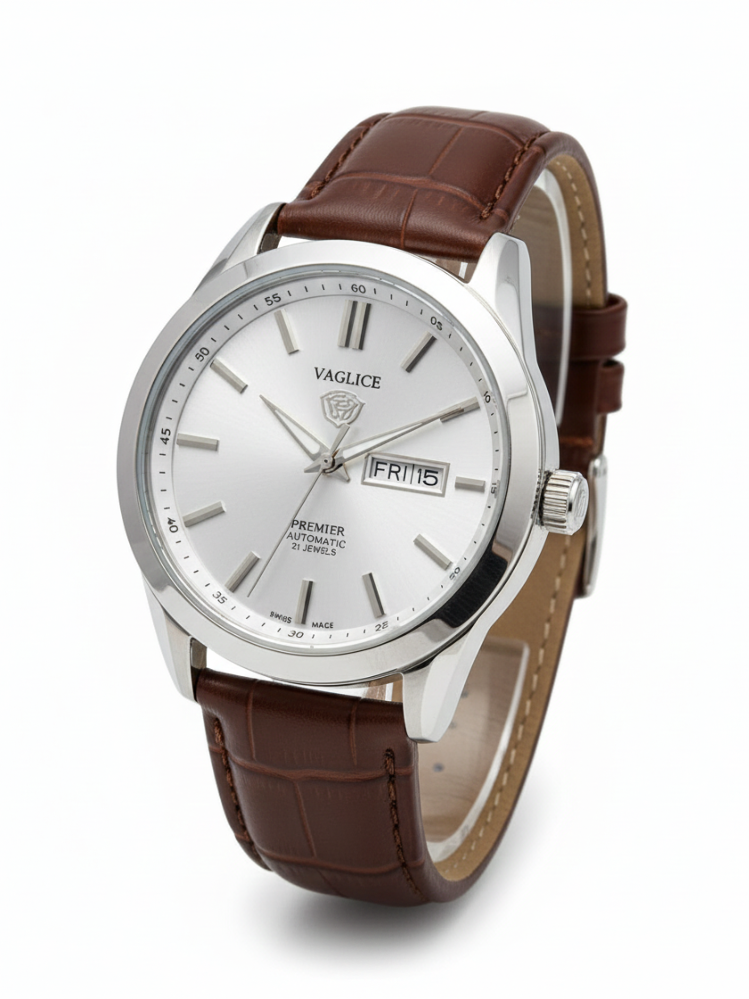 Strap: It is fitted with a sophisticated brown leather strap featuring a distinct crocodile or alligator pattern, which enhances the watch's formal and luxurious look.